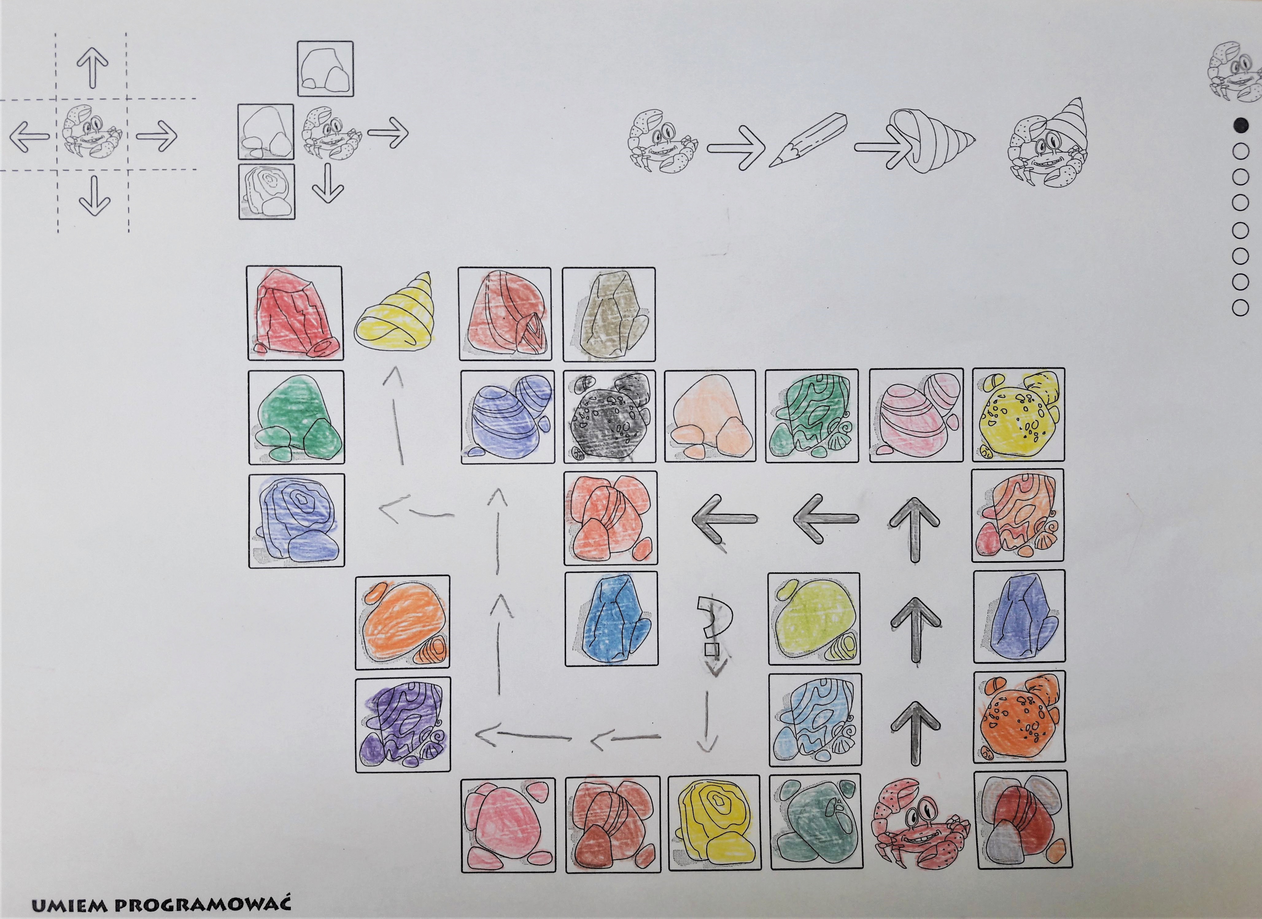Jeden z bohaterów programu – krab – może się poruszać do przodu, do tyłu, w lewo i w prawo. Naśladując więc kraba nie możemy się obracać na polu, ponieważ nasz bohater maszeruje do muszli zachowując ten sam kierunek swojego ustawienia. Jeśli chcesz być krabem musisz chodzić do tyłu (jak rak). Dużo przy tym śmiechu i zabawy. Z czasem dojście do muszli jest coraz łatwiejsze i nie trzeba chodzić po macie, aby instrukcja ze strzałek została prawidłowo ułożona.