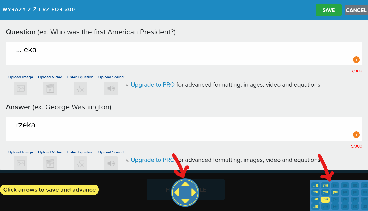 Na kolejnych polach planszy musimy wprowadzić pytanie i odpowiedź, aby kafelek wyświetlał się w trakcie gry. Kiedy pytanie i odpowiedź zostaną pomyślnie wprowadzone na kafelku, wartość punktów na planszy zmieni się na żółtą (pole może również pozostać puste).