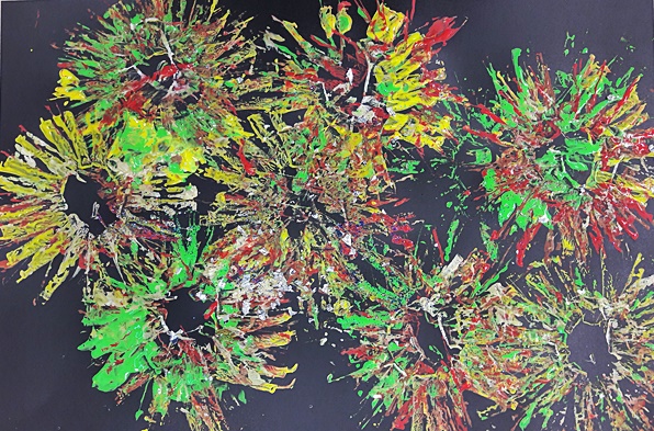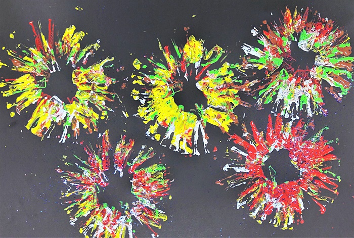 3. Malujemy fajerwerki kolejno wszystkimi kolorami, przyciskając umoczone w farbie rolki na czarnej kartce z bloku technicznego A3.