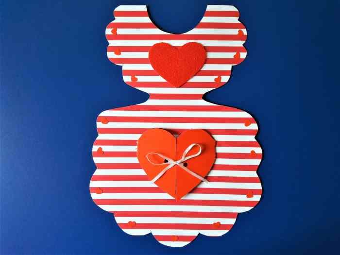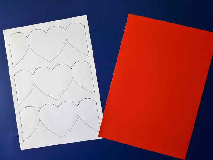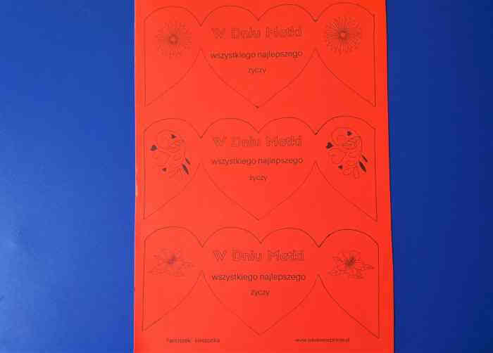 2. Następnie odrysowujemy szablon kieszonki lub drukujemy od razu na czerwonej kartce. W ten sposób uzyskamy na kieszonce od razu gotowe życzenia dla mamy.
