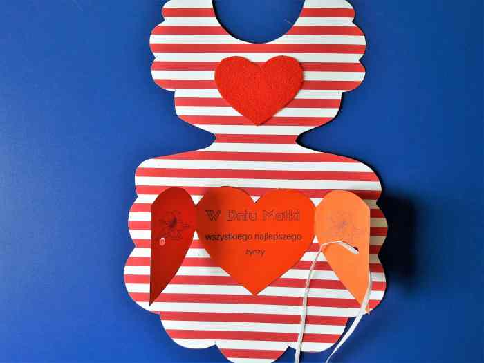 4. Po zawiązaniu kieszonki możemy przystąpić do ozdabiania naszej nietypowej laurki dla mamy. Możemy przykleić różnej wielkości serduszka. Te najmniejsze pochodzą z dziurkacza. Na pozostałe posiadam oczywiście szablony.