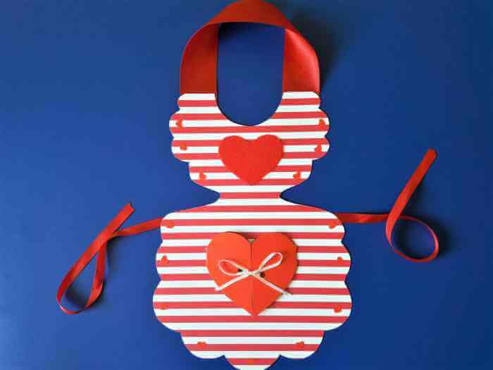 3. Składamy kieszonkę, dziurkujemy dwa otwory do przewiązania tasiemki i przyklejamy do fartuszka. „Skrzydełka” serduszka oczywiście zaginamy do środka.