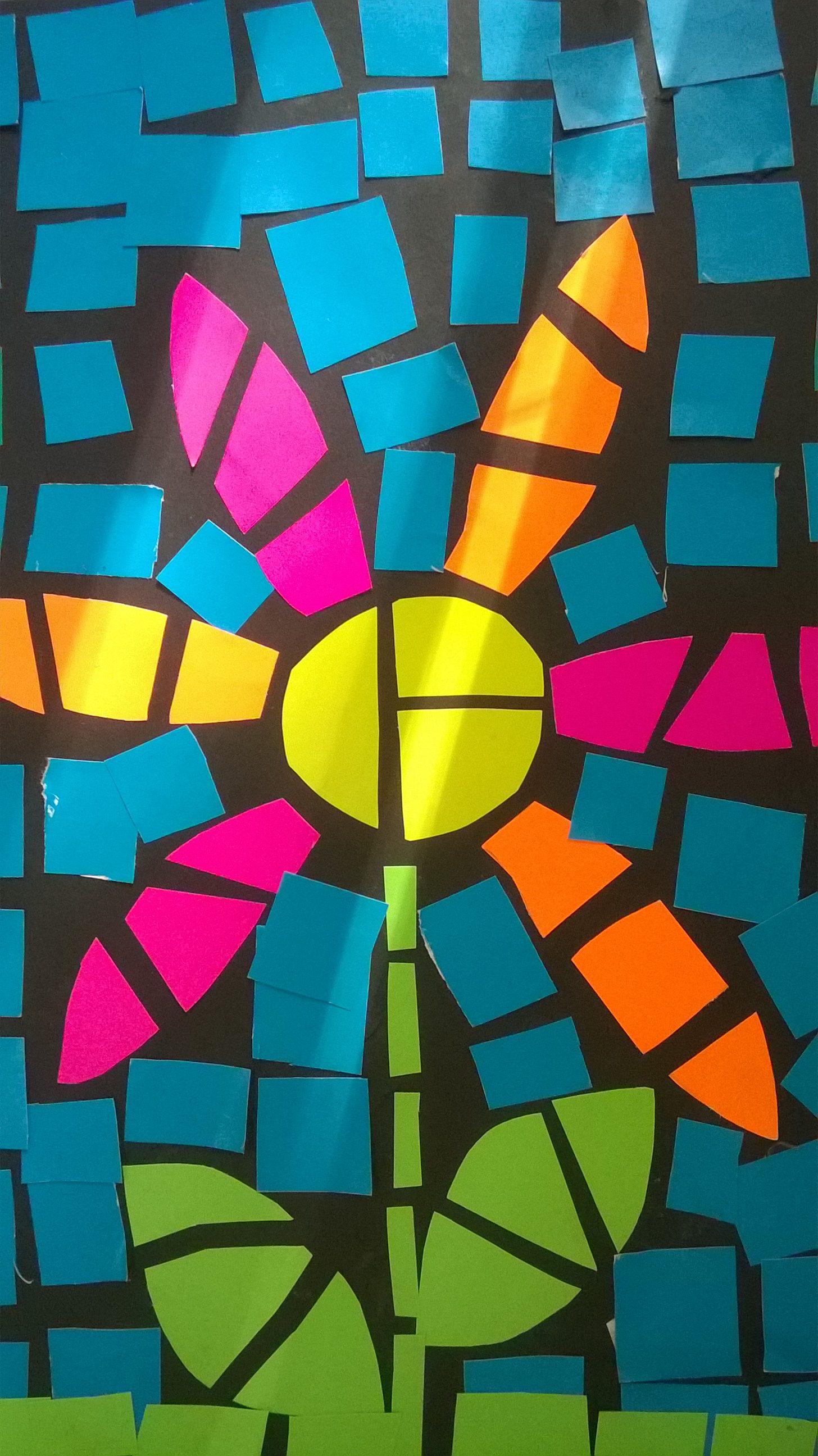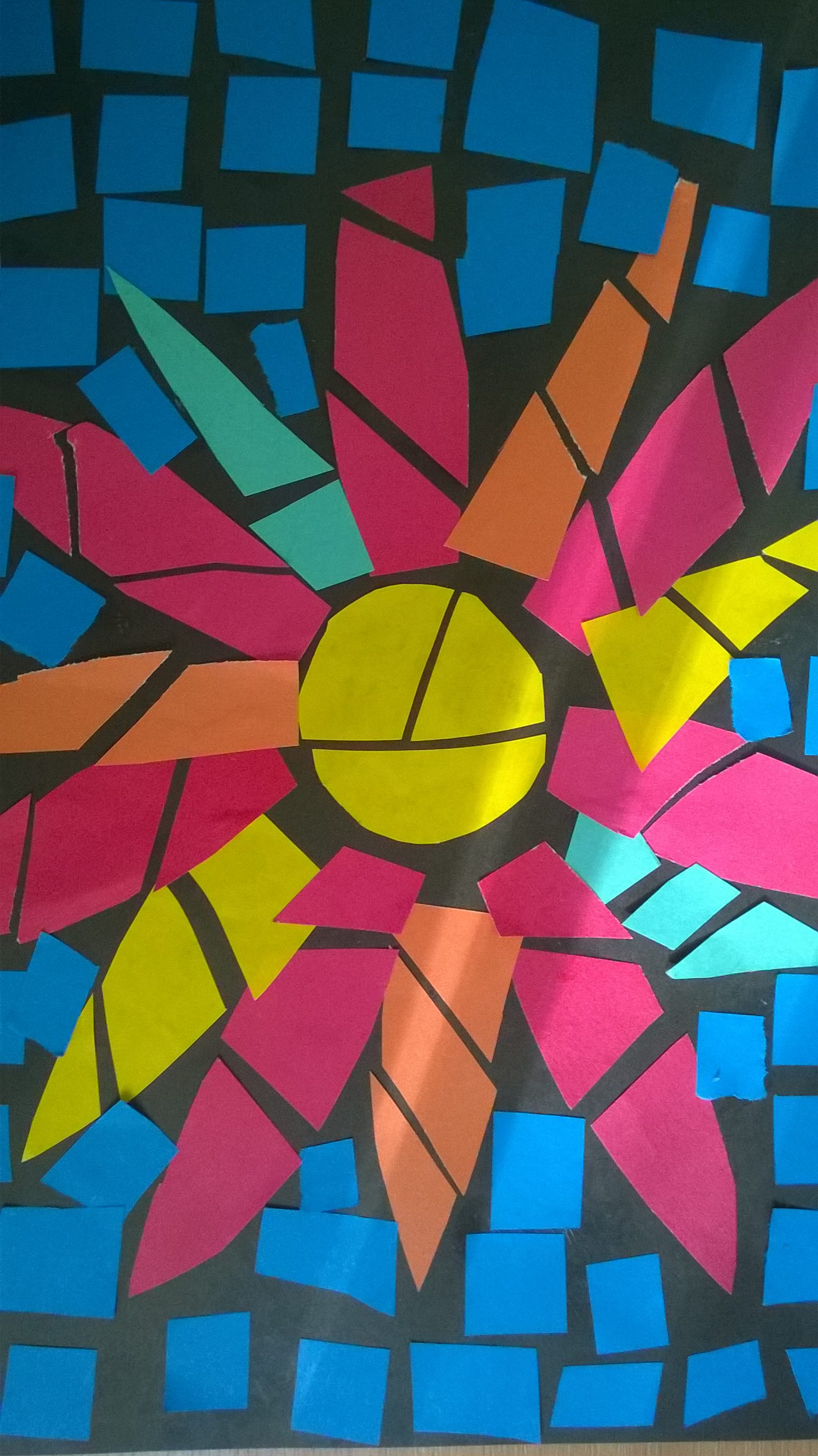 Przygotowujemy czarną kartkę na tło i kolorowe kartki z bloku rysunkowego lub wycinanki.