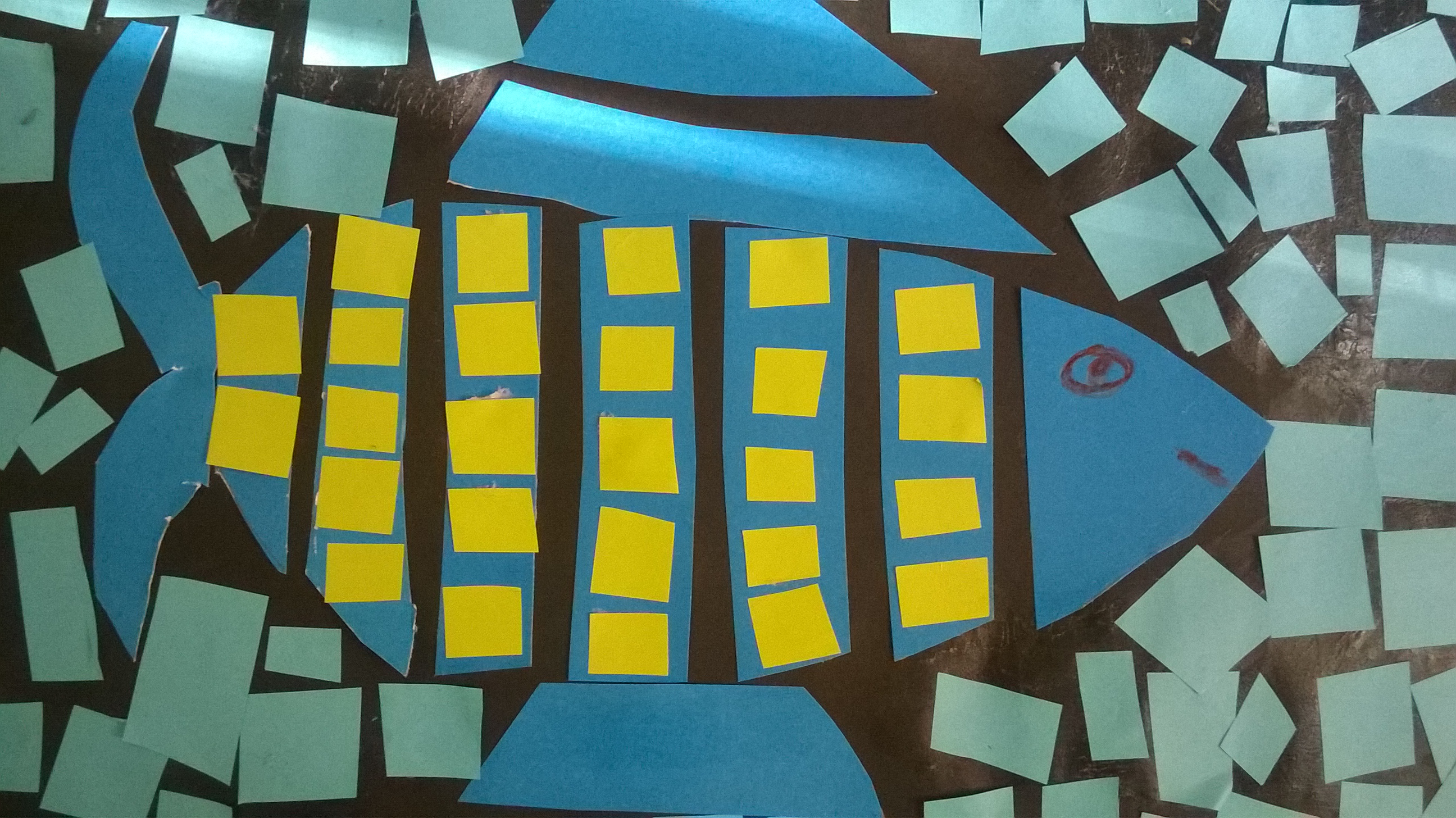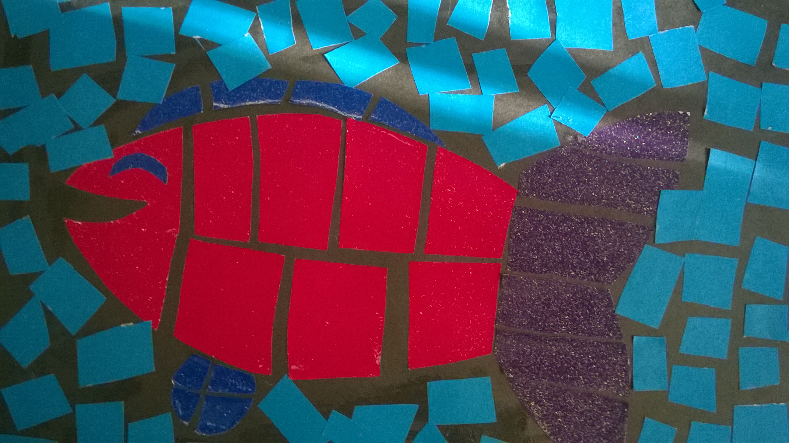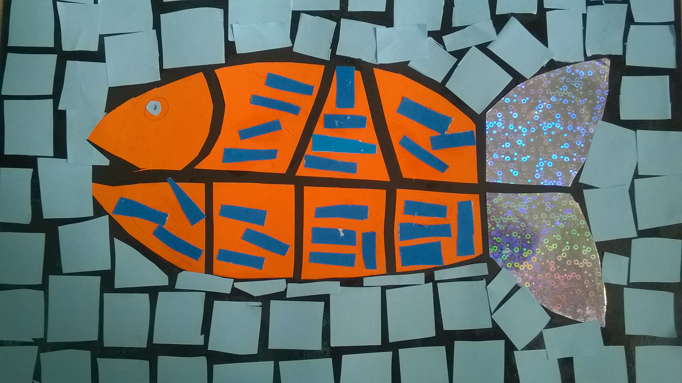 Rysujemy  i wycinamy zaplanowane elementy obrazka np. domek, drzewo, słońce lub, jak w moim przypadku, rybkę. Następnie rozcinamy na dowolne kwadraty, prostokąty, romby itp., pamiętając, aby przecinać po kolei paskami i dopiero po przyklejeniu przechodzić dalej. W przeciwnym razie, trudno będzie nam złożyć obrazek w całość. Konia z rzędem temu, kto spróbuje złożyć rozcięty na kawałki dach naszego domku, jeśli nie będziemy od razu układać rozciętych kawałków. Części przyklejamy w pewnym oddaleniu od siebie, tak by na koniec praca sprawiała wrażenie witrażu.