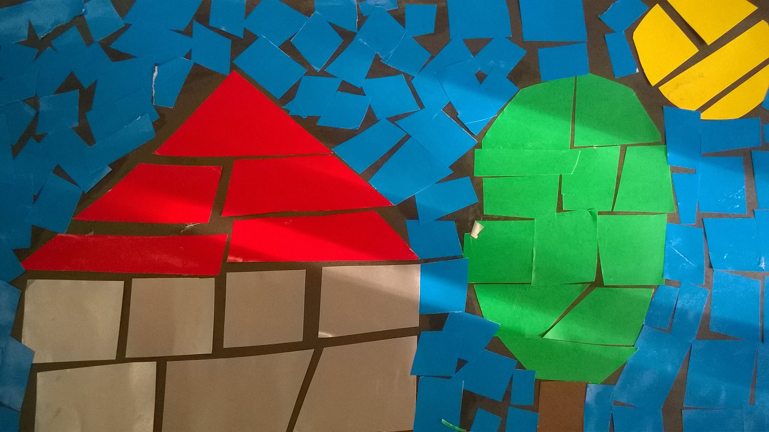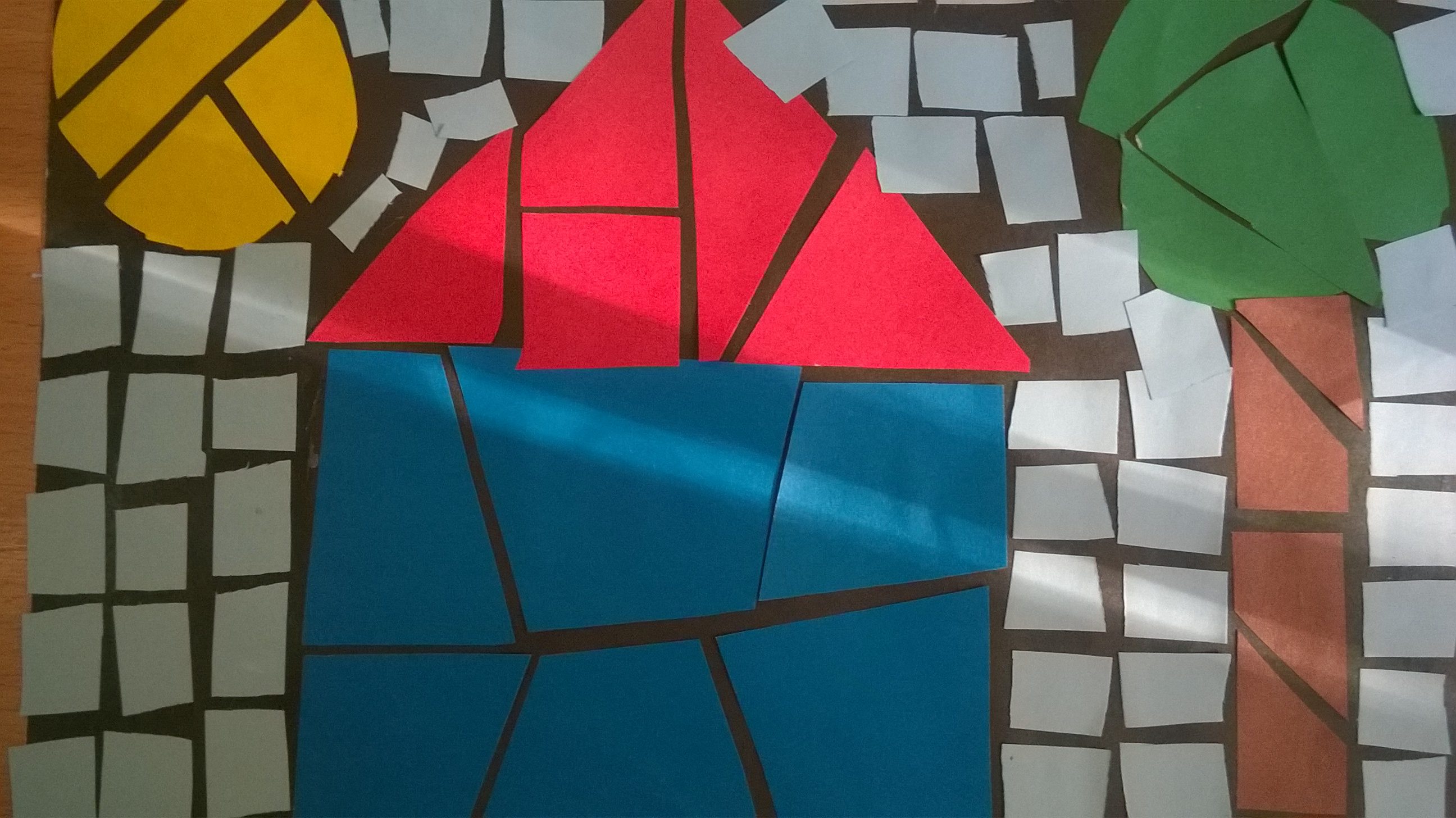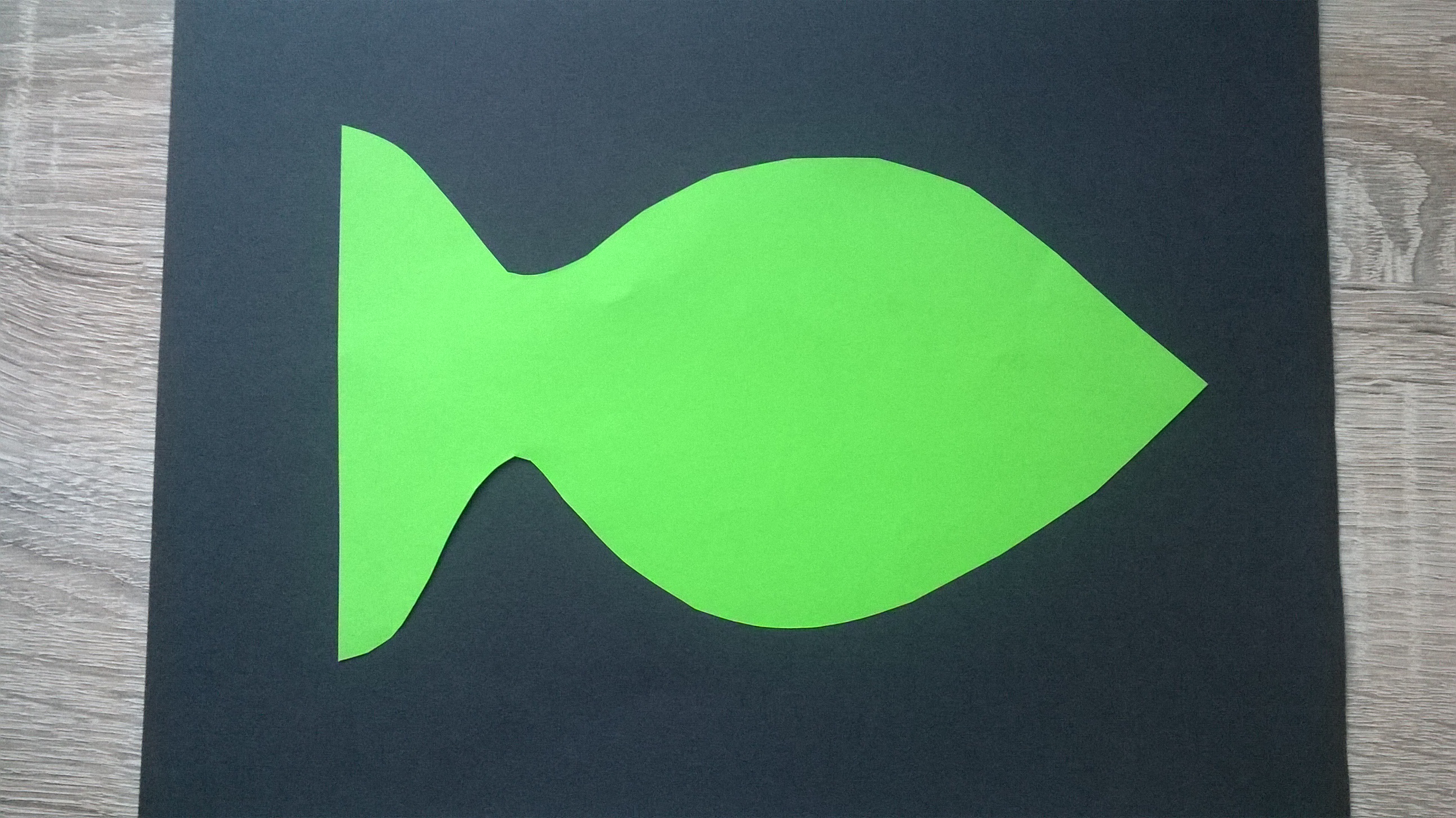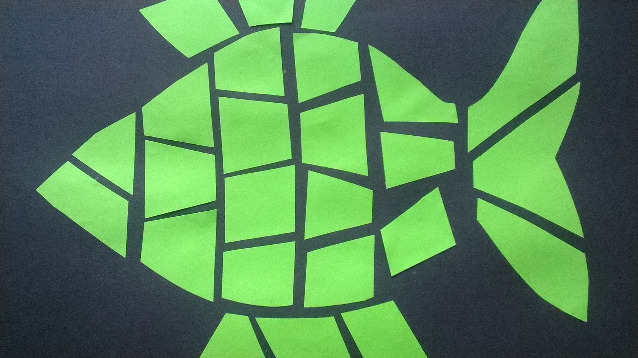 Rysujemy  i wycinamy zaplanowane elementy obrazka np. domek, drzewo, słońce lub, jak w moim przypadku, rybkę. Następnie rozcinamy na dowolne kwadraty, prostokąty, romby itp., pamiętając, aby przecinać po kolei paskami i dopiero po przyklejeniu przechodzić dalej. W przeciwnym razie, trudno będzie nam złożyć obrazek w całość. Konia z rzędem temu, kto spróbuje złożyć rozcięty na kawałki dach naszego domku, jeśli nie będziemy od razu układać rozciętych kawałków. Części przyklejamy w pewnym oddaleniu od siebie, tak by na koniec praca sprawiała wrażenie witrażu.