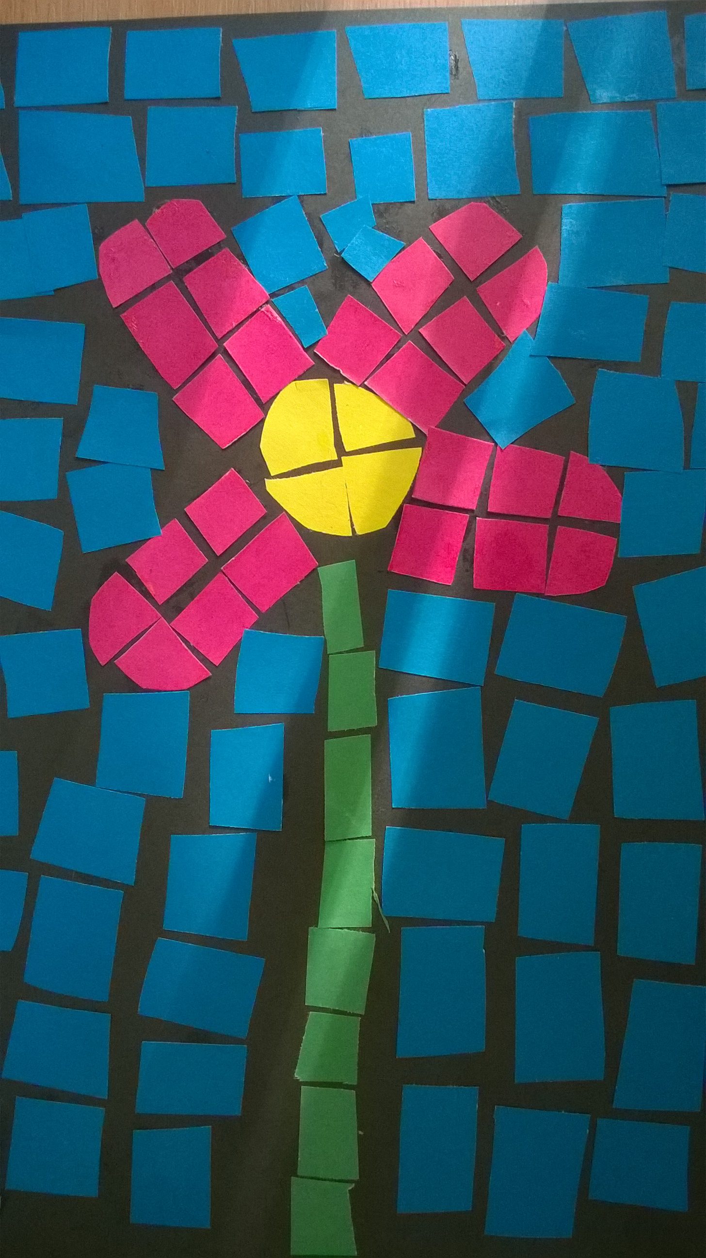 Na koniec tniemy niebieski papier na paski, a potem na kwadraty i przyklejamy je pamiętając, aby nie dotykały się bokami.