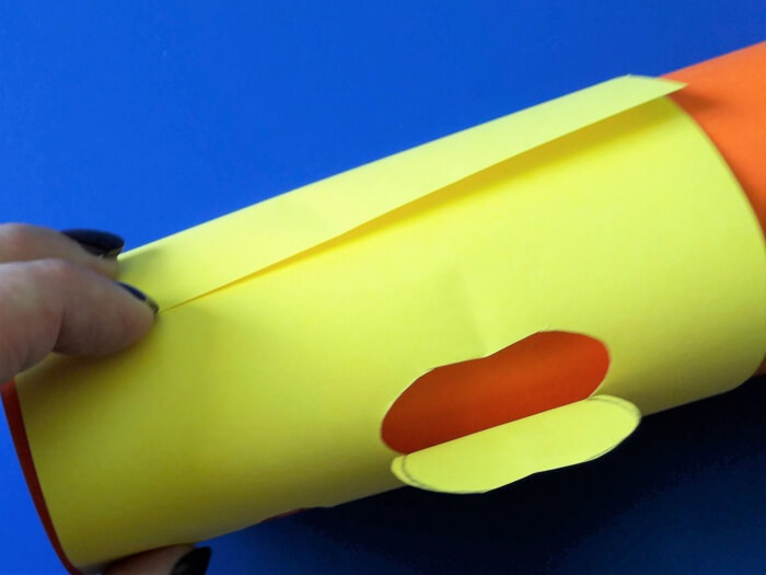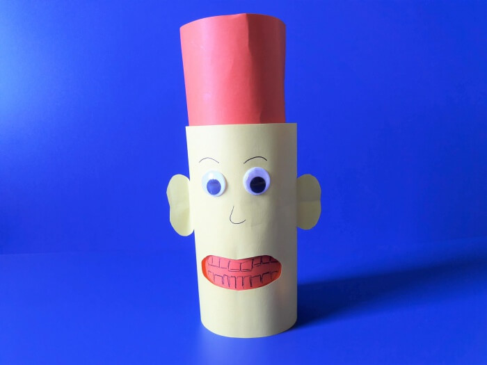 4. Sklejamy rolki. Jeśli wybraliście papier techniczny, polecam zszywacze. Zewnętrzną rolkę dopasowujemy do wyższej rolki, tak by można było ją swobodnie obracać, ale żeby też nie była za luźna. Warto wykonać ją z rysunkowego papieru, ponieważ łatwiej będzie wyciąć nam usta i uszy. Środek może być „techniczny”.