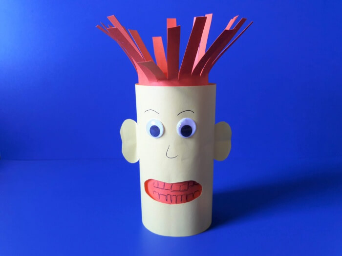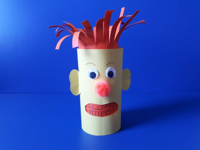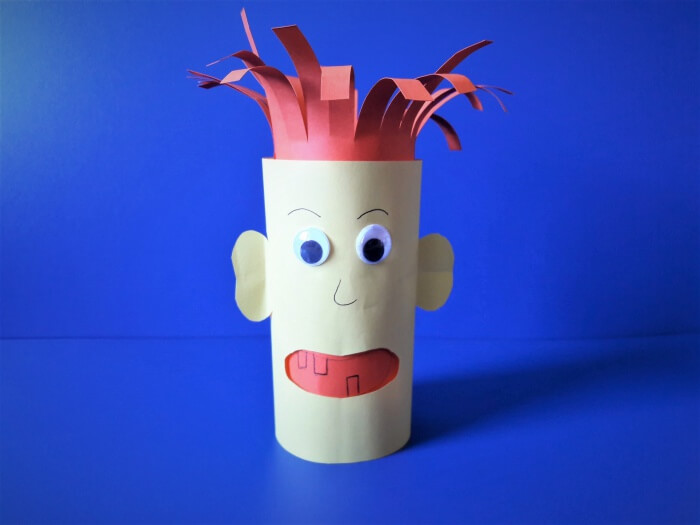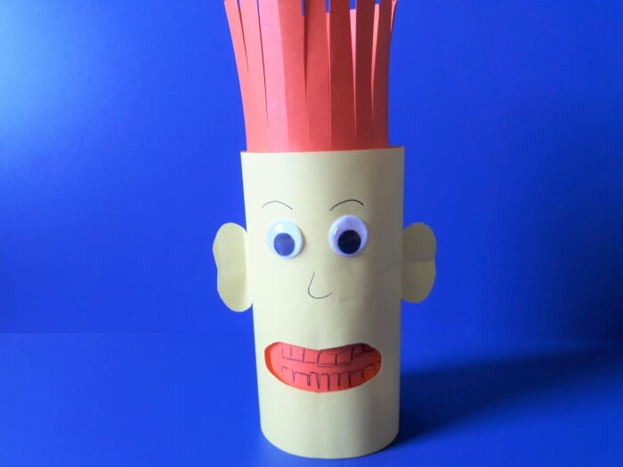 5. Na koniec przystępujemy do wykonania fryzury ludzikowi, który ma przekonać dzieci do mycia zębów. Nacinamy wyższą rolkę, a następnie modelujemy włosy wyginając je lub „wykręcając” nożyczkami.