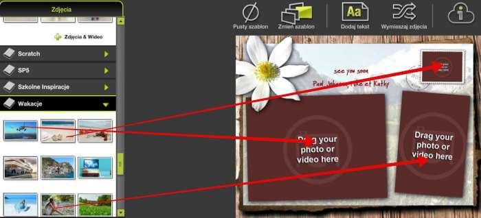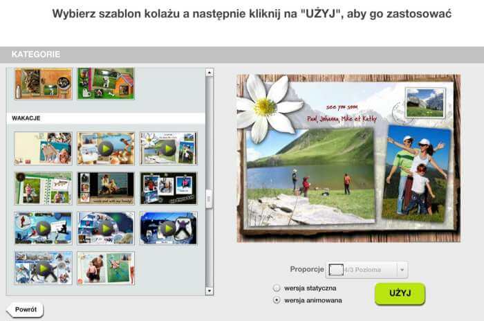 Po wybraniu szablonu przeciągamy wybrane zdjęcia. Jeżeli układ (kolejność) fotografii nam nie odpowiada, klikamy Wymieszaj zdjęcia. Układ możemy zmieniać dowolną ilość razy, aż osiągniemy zamierzony efekt.