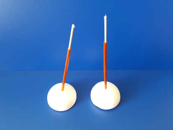 2. Przecinamy małą kulę na połowę i wbijamy patyki do szaszłyków. Na nóżki nakładamy kolorowe słomki.