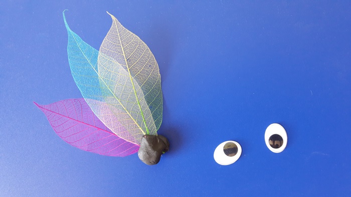 Podobnie robimy z liśćmi preparowanymi. Przygotowujemy też oczka i dziób z plasteliny.