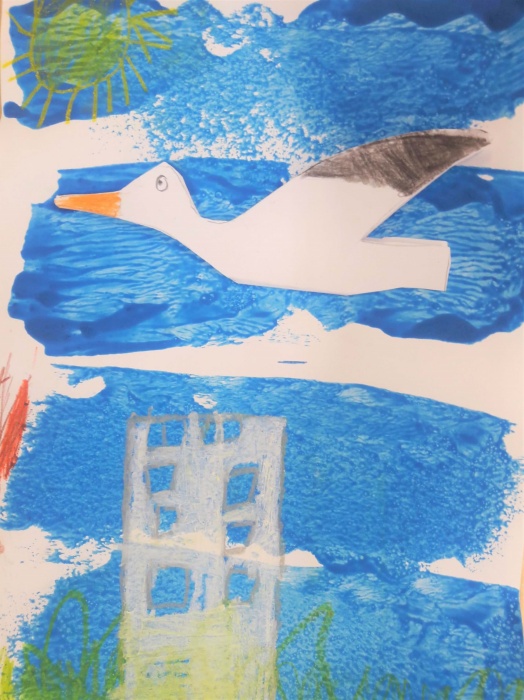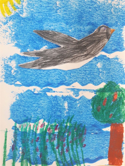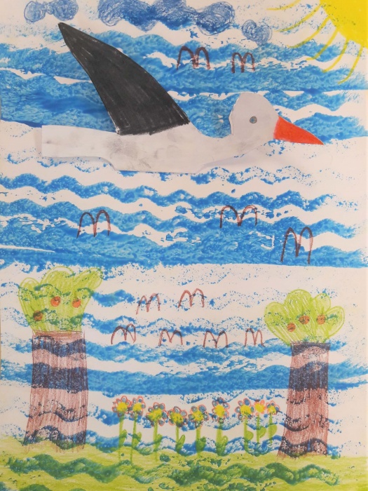Następnie po wyschnięciu farby rysujemy kształt bociana lub jaskółki na złożonej kartce technicznej. Jedną stronę kolorujemy, a drugą przyklejamy do naszej niebieskiej kartki.