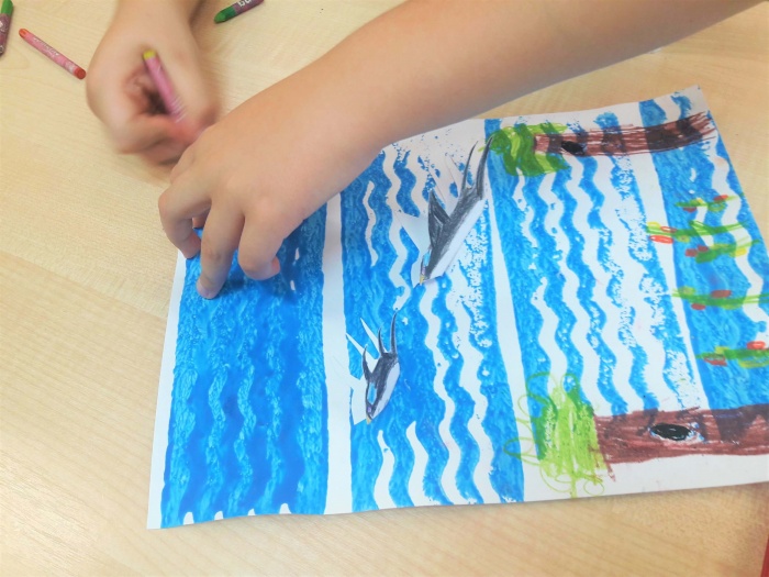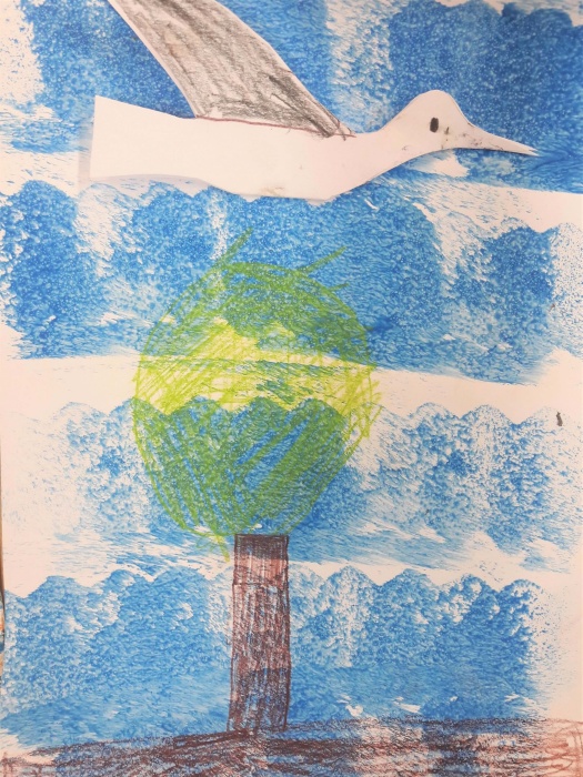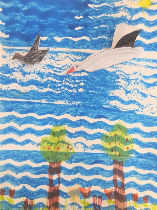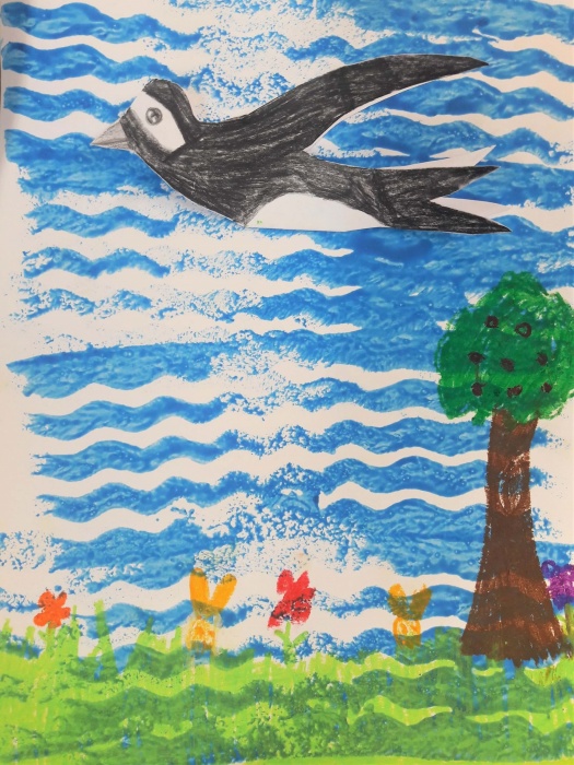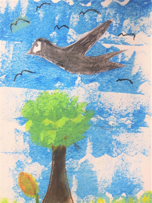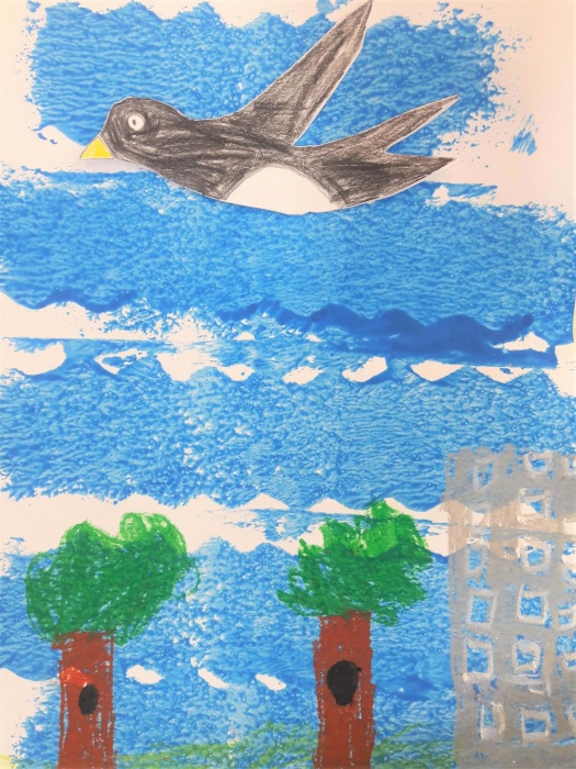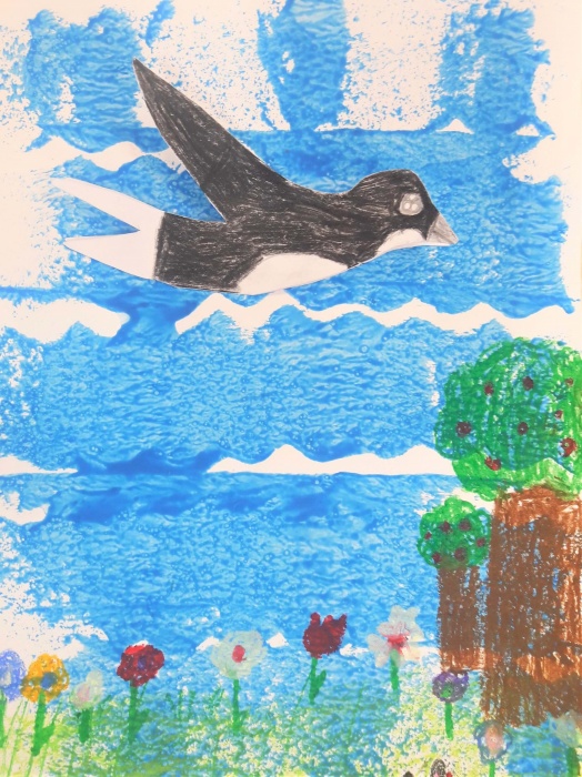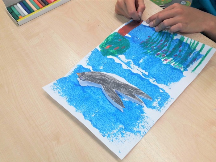 Na koniec malujemy pastelami trawę, drzewa, domy itd., czyli wszystko to, co zobaczyły ptaki z góry. Trzeba przecież pamiętać, że mają świetny wzrok.