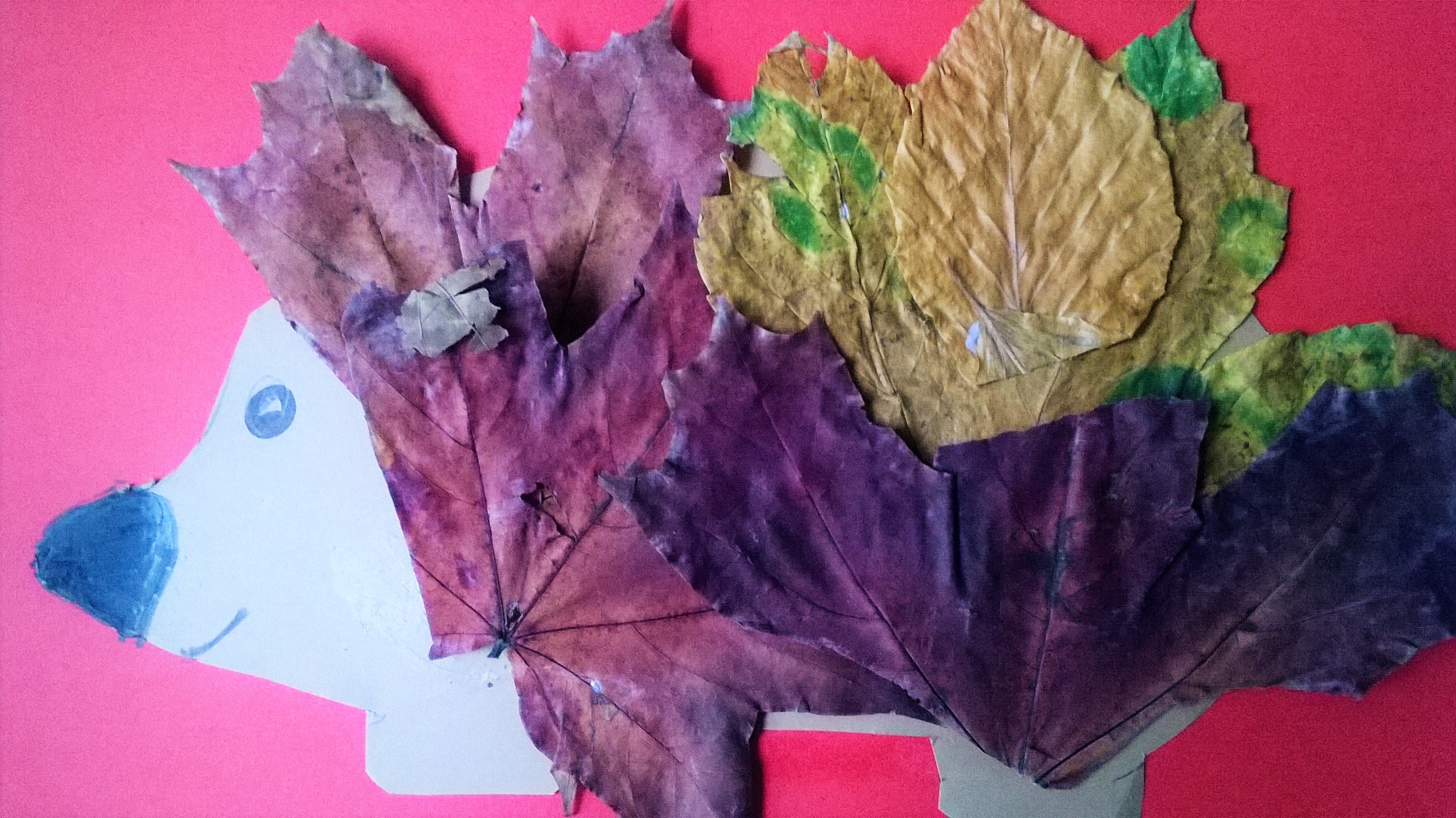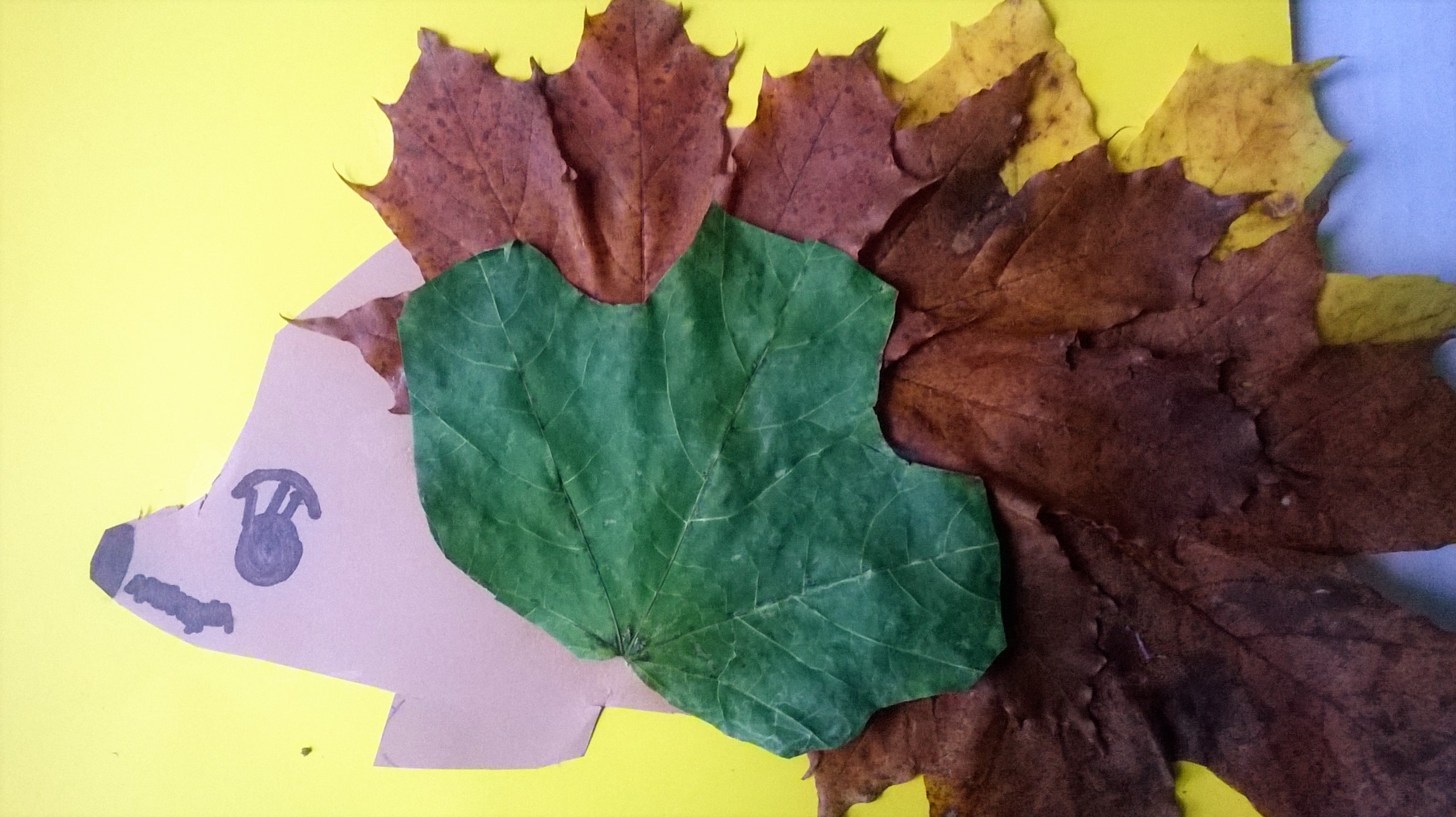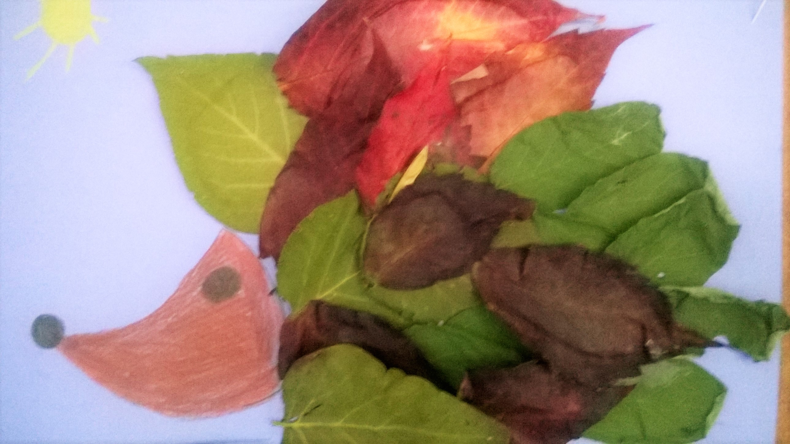 Pyszczek jeża możemy narysować lub wykleić plasteliną albo wyciąć z kolorowego papieru. Na igiełki wybieramy raczej wąskie długie liście i jesienna praca plastyczna gotowa.