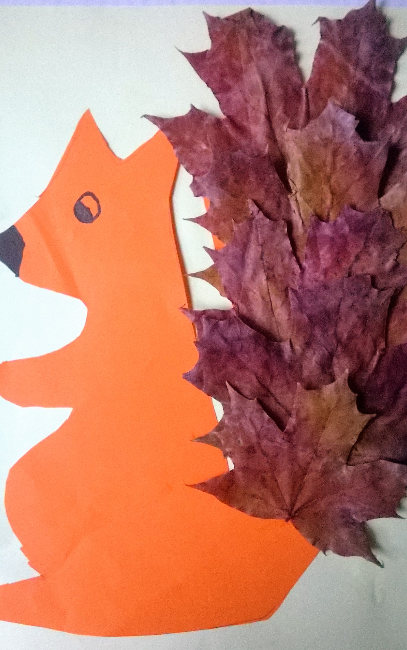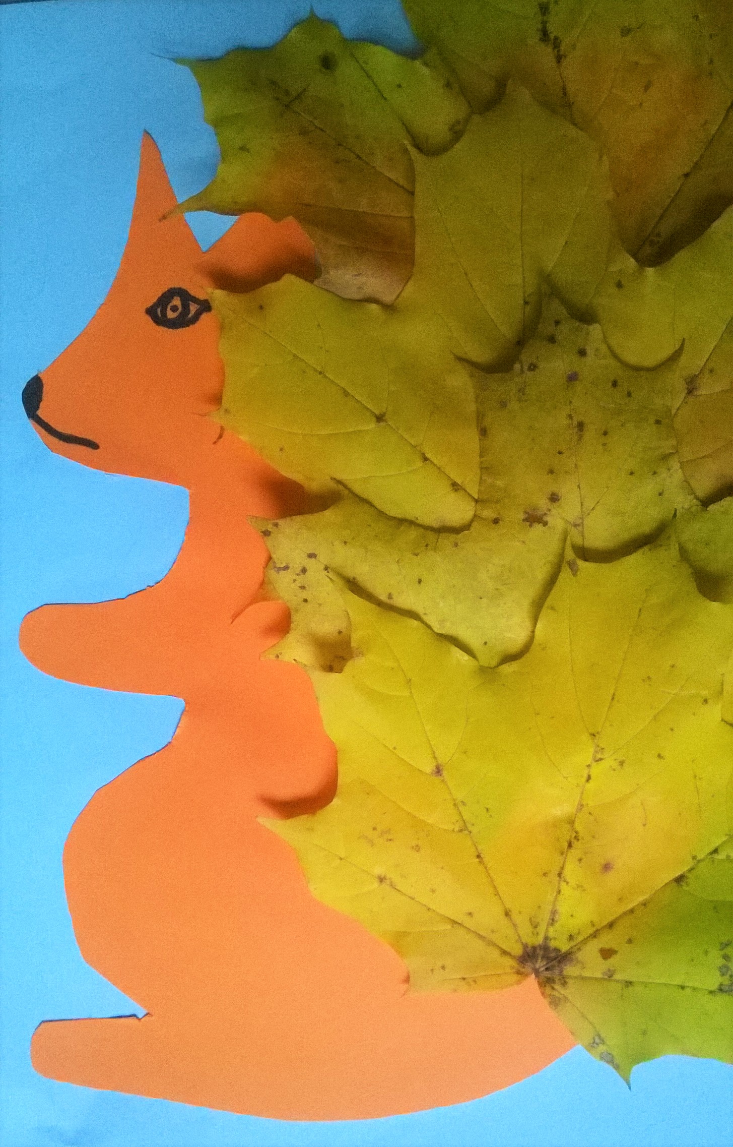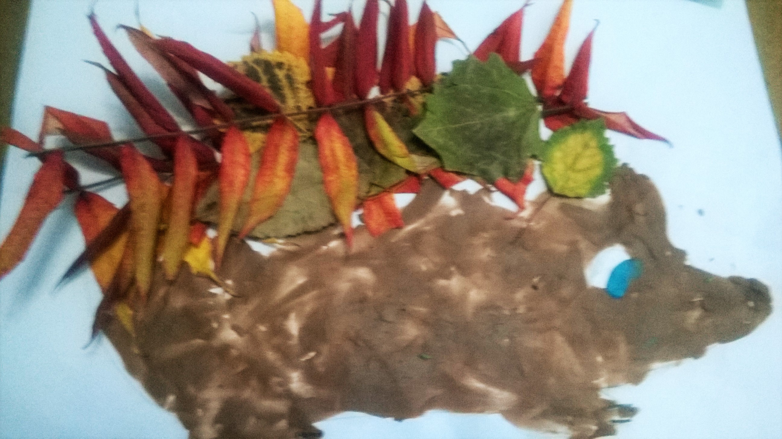 Pyszczek jeża możemy narysować lub wykleić plasteliną albo wyciąć z kolorowego papieru. Na igiełki wybieramy raczej wąskie długie liście i jesienna praca plastyczna gotowa.