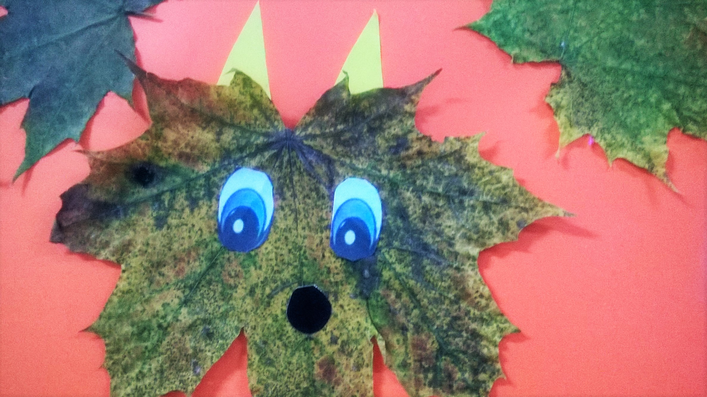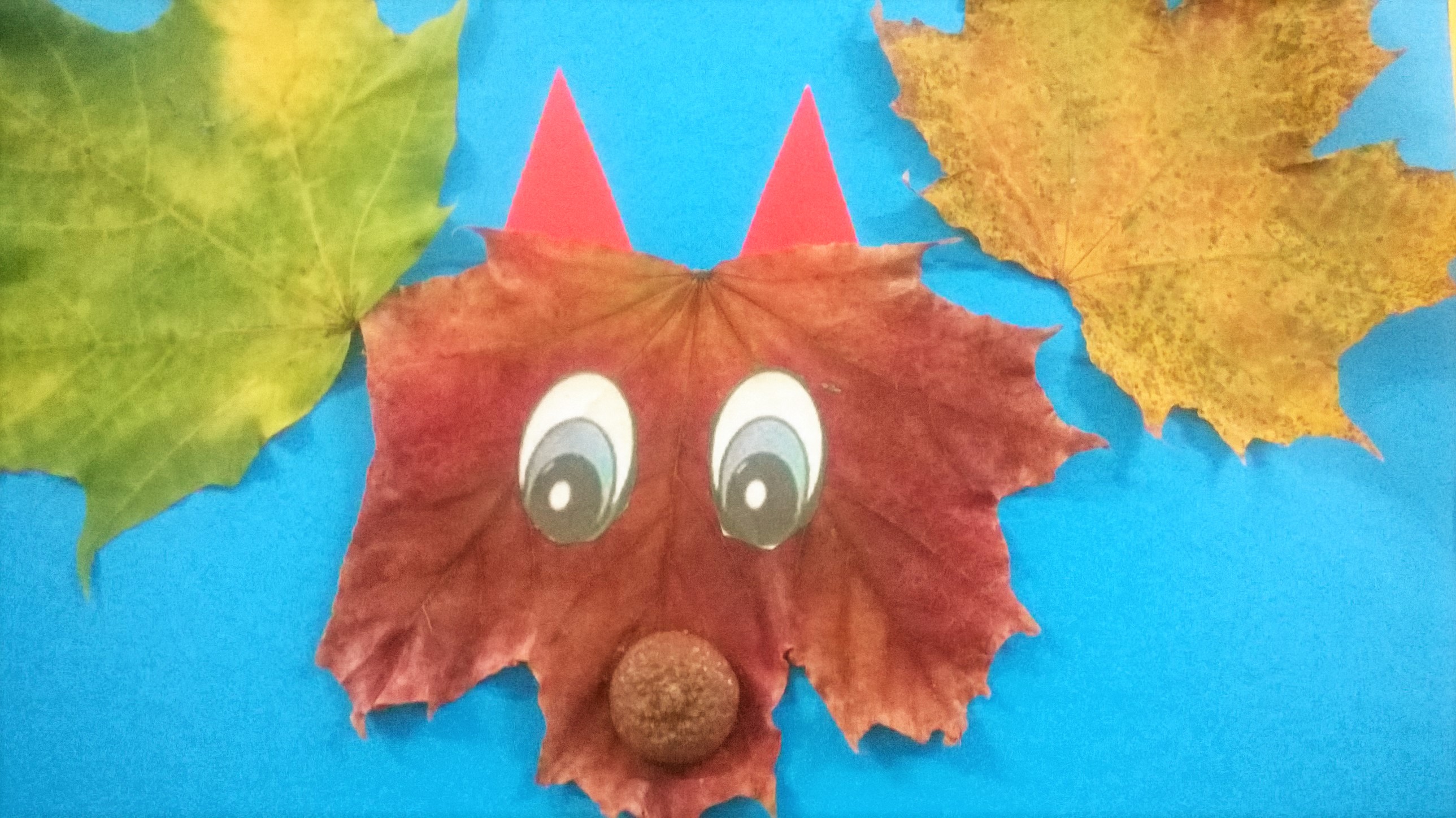 Jesienne prace, to również wykorzystanie liści jako główne tworzywo. Zadajemy sobie pytanie: Co ten liść mi przypomina? Liść klonu okazuje się wspaniałą głową liska. Doklejamy tylko oczy i uszy z papieru oraz pyszczek np. z żołędziowej czapeczki i jesienna praca gotowa.