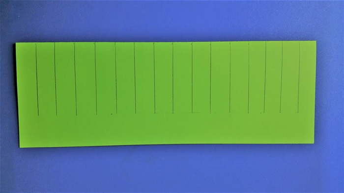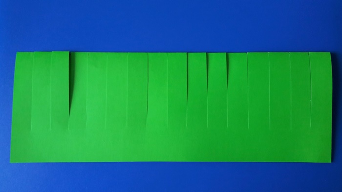 1. Zginamy zieloną kartkę z bloku rysunkowego na połowę (wzdłuż) i nacinamy od strony grzbietu paski o szerokości około 1,5 – 2 cm. Dzieciom warto takie paski narysować, ponieważ trudno będzie im zachować równe odległości.
