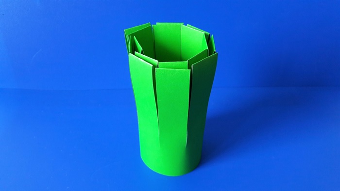2. Naciętą kartkę zwijamy w rulonik i sklejamy u podstawy. Następnie wyginamy paski na boki.
