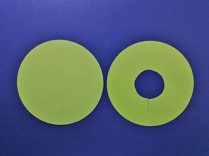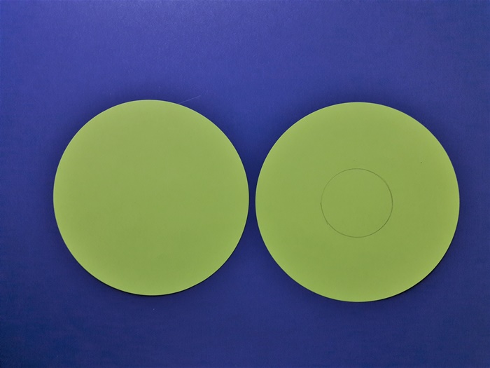 4. Po wykonaniu bukietu przystępujemy do przygotowania podstawki do naszej pracy plastycznej z okazji Dnia Kobiet. W tym celu możemy wykorzystać 2 zielone kółka do origami lub po prostu wyciąć 2 koła z zielonego papieru o średnicy 15 cm. Na jednym z kół odrysowujemy podstawę naszej łodyżki i wycinamy środek nacinając koło.