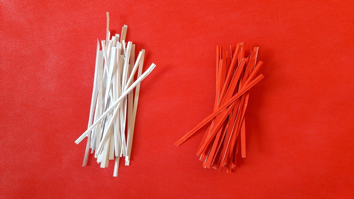 2. Tniemy tekturę falistą po rowkach na cieniutkie paseczki (po 20 z każdego koloru).