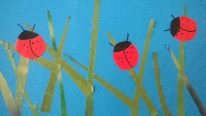 Paseczki układamy na białej lub błękitnej kartce w nieregularny sposób, a na nie przyklejamy 3-4 czerwone owalne kółka. Domalowujemy czarnym mazakiem kropki, główkę oraz czułki i biedronki gotowe.