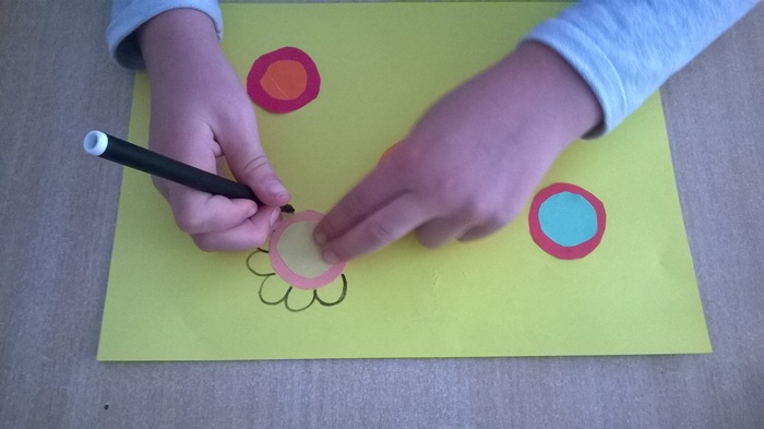 Na kolorowej kartce przyklejamy barwne kółeczka różnej wielkości, tworząc pawie oczka. Następnie dorysowujemy flamastrem płatki, łodyżki i listki kwiatów według własnej inwencji.