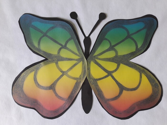 Witraże to dość trudna forma dla dzieci. Im większy witraż, tym wydaje się łatwiejszy w wykonaniu, ponieważ większe elementy łatwiej wyciąć nożyczkami. Do wykonania motyla przyda się nam specjalny tęczowy papier do witraży.