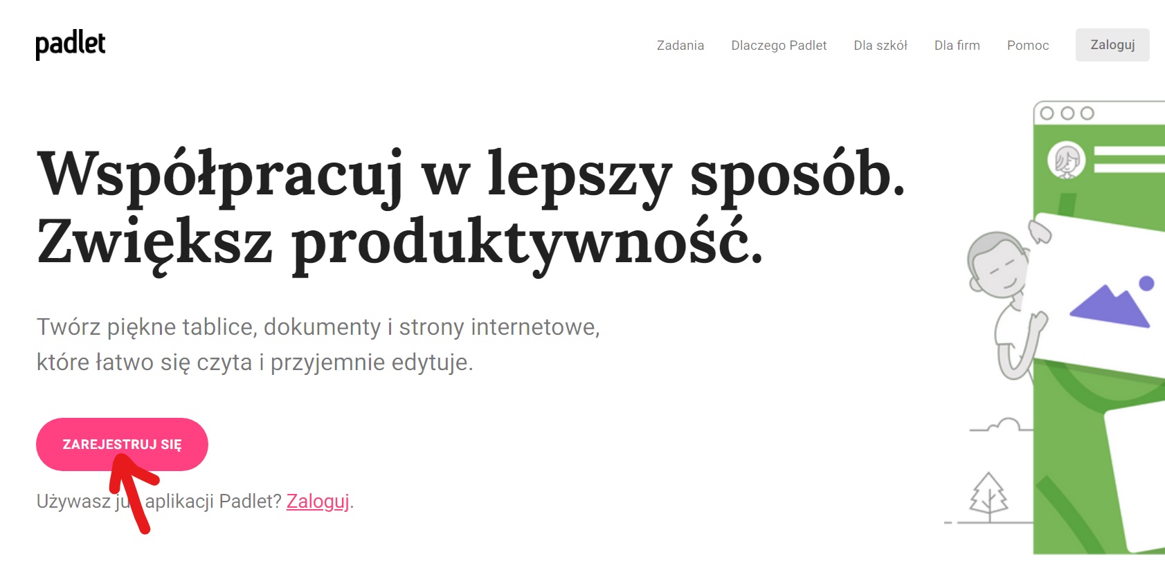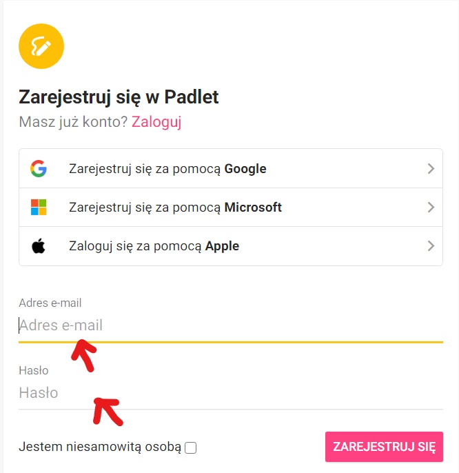 Wejdź na stronę padlet.com i zarejestruj się np. podając adres e-mail i hasło
