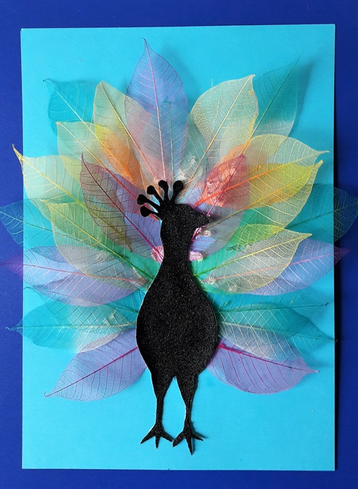 Doklejamy oko ptaka, a na liściach „pawie oczka” i czekamy aż wyschnie klej.