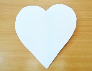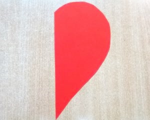 Wycinamy białe serce, składamy na połowę i odrysowujemy od powstałego szablonu serce czerwone. Naklejamy czerwoną połówkę i gotowe.