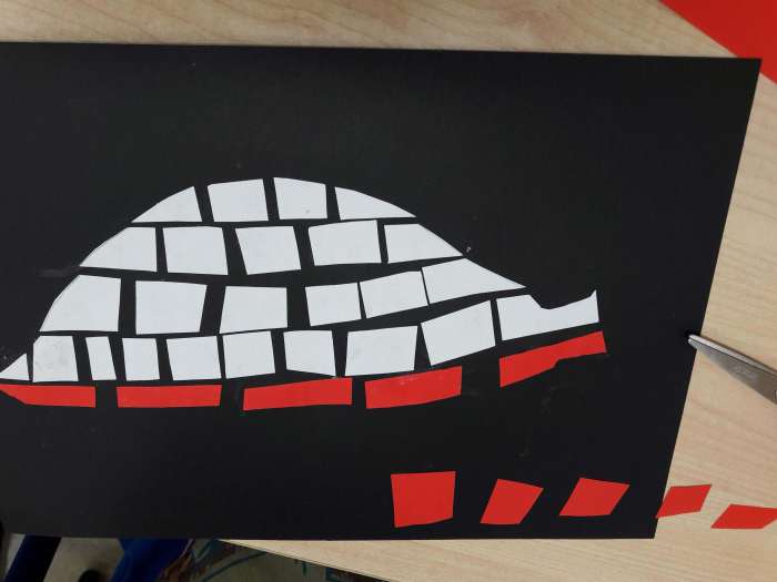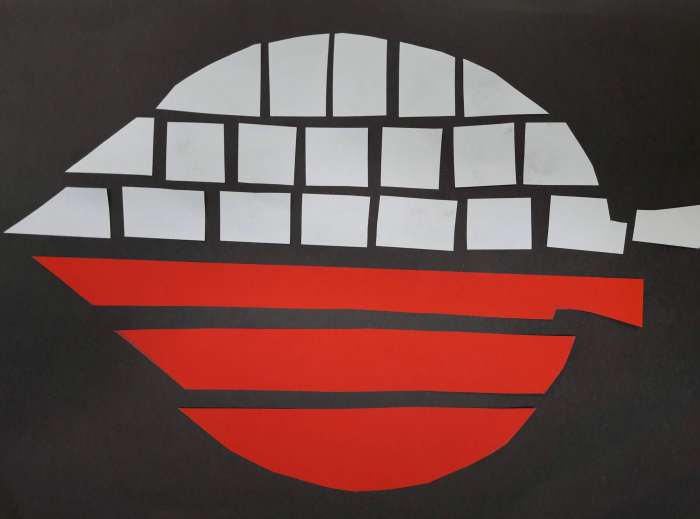 Wycinamy białe i żółte kółka. Zaginamy je według wzoru na zdjęciu i przyklejamy na czerwoną kartkę.