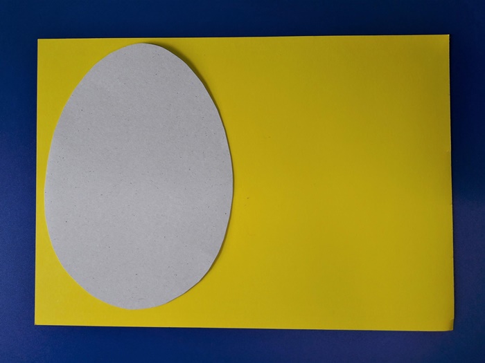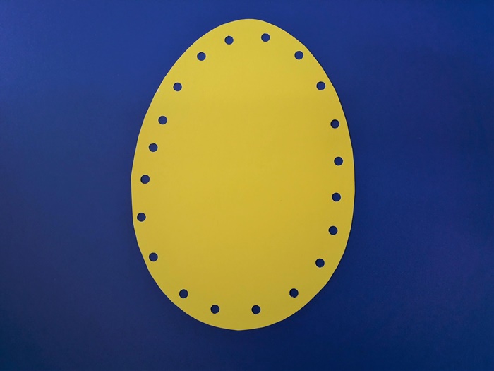 1. Z połowy kolorowej kartki z bloku technicznego wycinamy kształt jajka. Dokoła dziurkujemy otwory dziurkaczem w równych odstępach. Warto sobie narysować na brzegach kreski w równych odstępach i dopiero do nich przykładać dziurkacz.