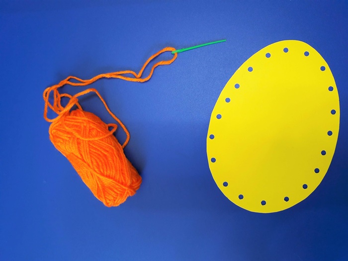2. Dobieramy kolor włóczki do naszej  wielkanocnej pisanki. Nawlekamy plastikową igłę, pamiętając by nitka nie była zbyt długa, ponieważ będzie się dzieciom plątać. Możemy oczywiście użyć kilku kolorów wełny, ale wtedy trzeba by było zrezygnować z pomponików, bo praca będzie zbyt pstrokata.