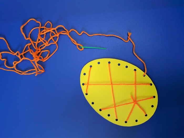 Wielkanocna pisanka z nietypowych materiałów może być pierwszym krokiem do nauki szycia z młodszymi dziećmi. W tym celu możemy wykorzystać plastikowe igły z dużymi otworami. Są dość duże, łatwe w nawlekaniu i świetnie pasują do małych rączek. Przy okazji powstanie ciekawa pisanka na wystawę w sali przedszkolnej lub w szkole.
