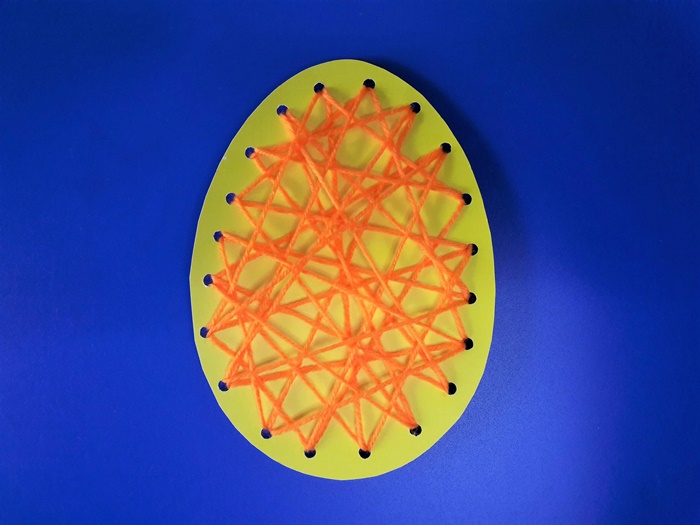 3. Możemy rozpocząć naukę szycia. Przewlekamy igłę przez otwory przeciągając włóczkę w różnych kierunkach. Nitka szybko się kończy, ale wystarczy dowiązać z tyłu wielkanocnej pisanki następny kawałek i można szyć dalej.