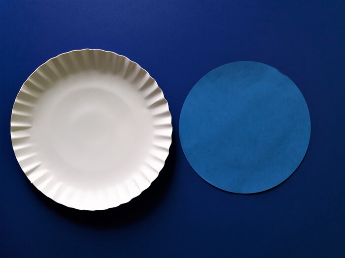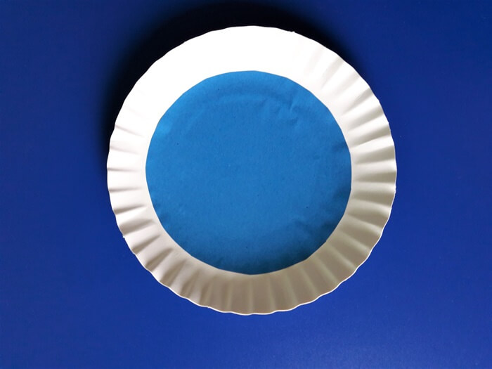 Przygotowujemy talerzyk papierowy, do którego przyklejamy niebieskie kółko o średnicy 15 cm. Może to być gotowe koło z zestawu do origami lub wycięte z technicznej niebieskiej kartki. Dzieci mają na ogół problemy z wycinaniem koła, dlatego, jeżeli zależy nam na estetycznej i starannej pracy, to warto skorzystać z gotowych kół.