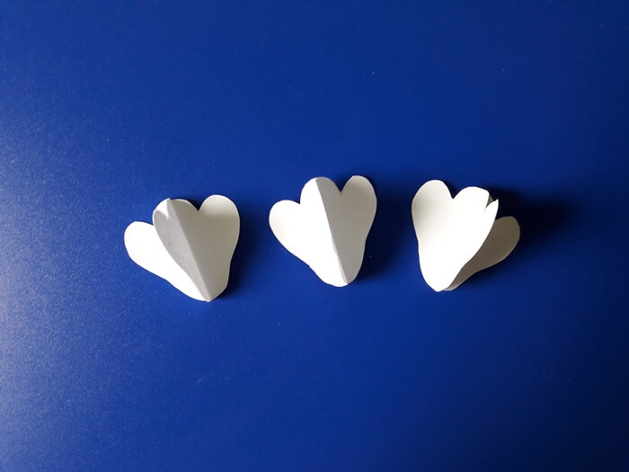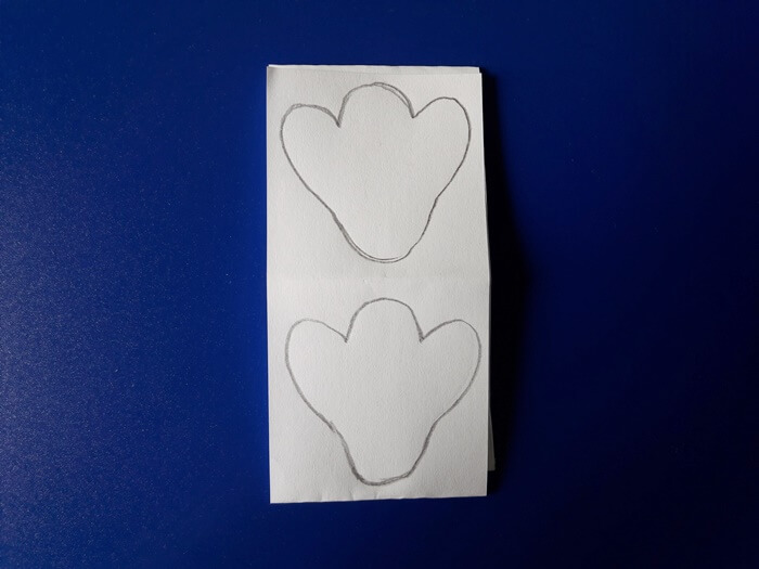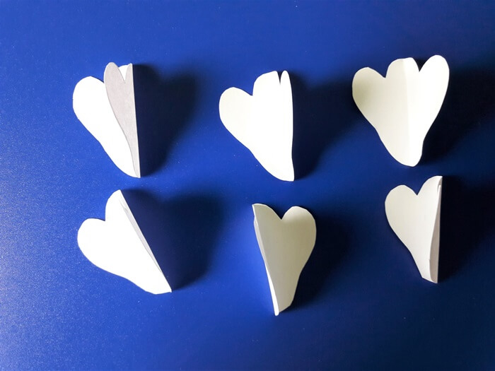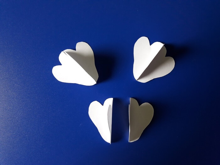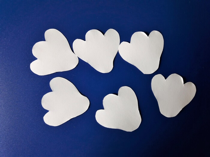 4. Teraz pora na przygotowanie główek naszych papierowych przebiśniegów. Na białym pasku papieru z bloku rysunkowego odrysowujemy główkę kwiatka, tak by w sumie powstało 6 elementów. Każdy kwiatek składamy wzdłuż na połowę.