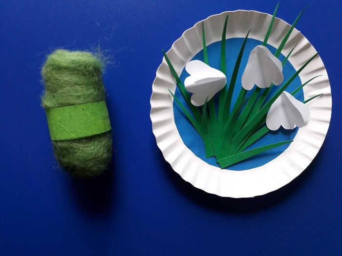 3. Połowę powstałych łodyżek przebiśniegów, smarujemy klejem i przyklejamy do talerzyka tylko przy szerszym końcu. Sztywny karton fajnie się wygina, sprawiając, że praca jest przestrzenna.